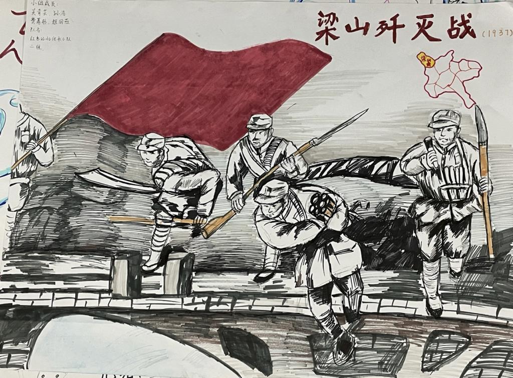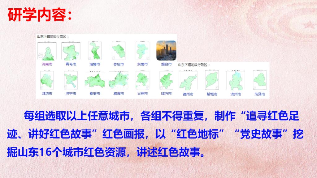 在研学过程中,同学们分成小组,以“我讲你画”的方式,讲山东红色故事,画山东红色足迹,深刻认识和理解山东“红色地标”、“红色人物”、“红色故事”等红色基因,深入挖掘山东16个城市的红色资源,图文并茂地绘制了具有各地市红色特征的画报,同心向党传承山东红色文化及其时代价值。