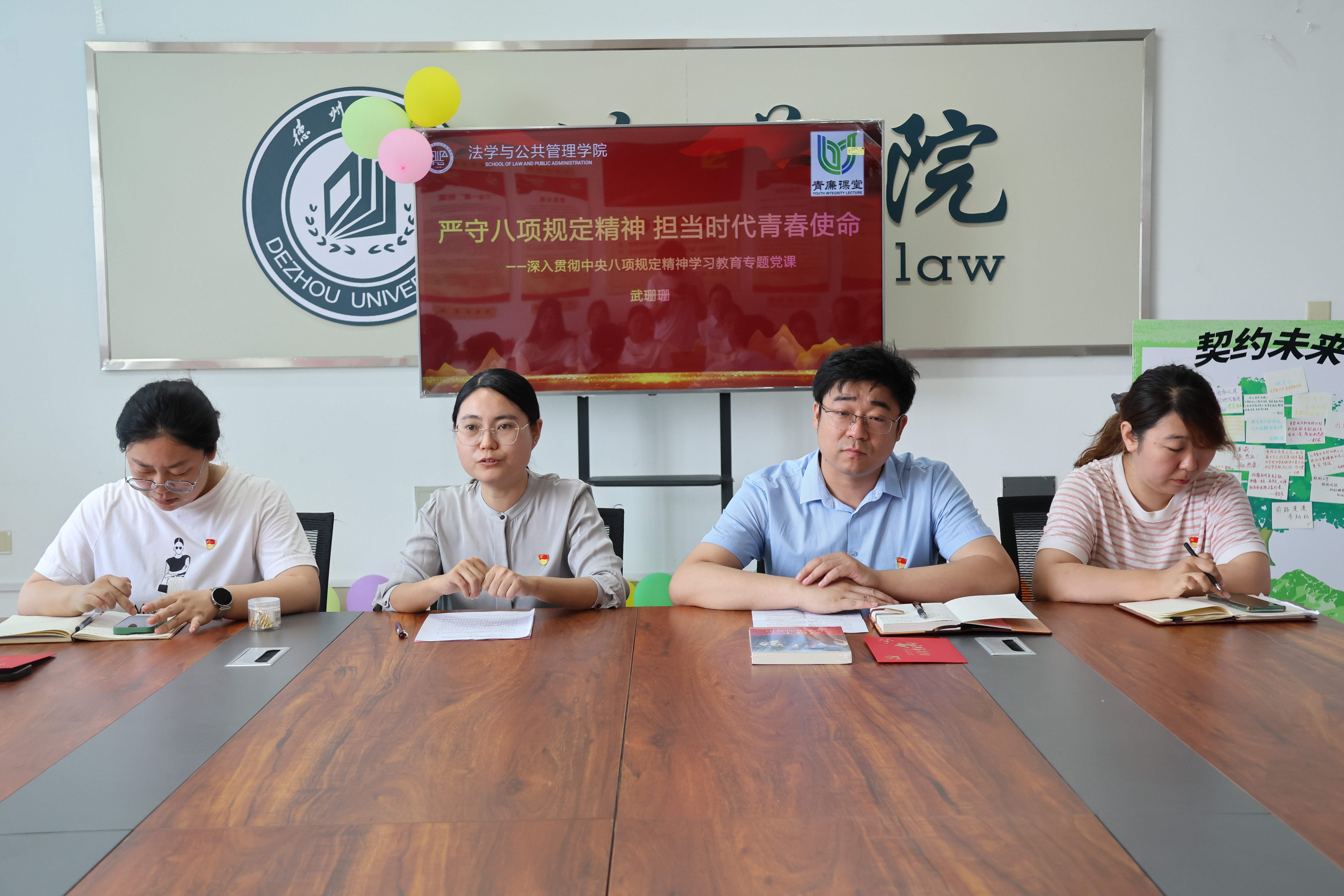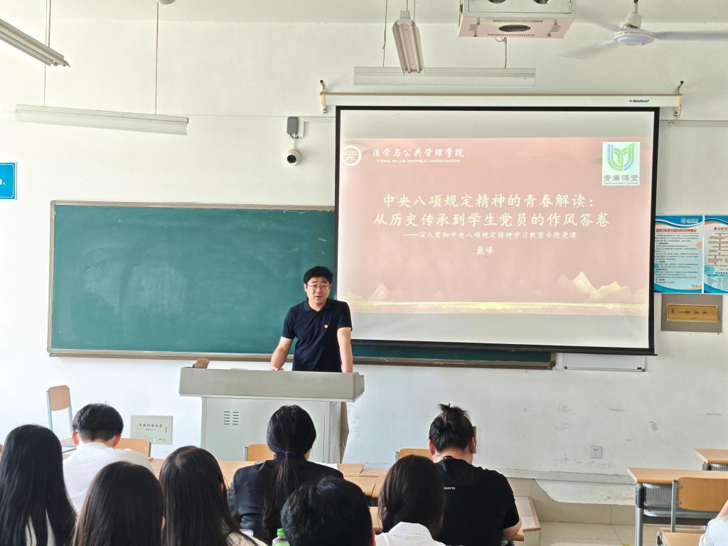 学院党委书记讲授《严守中央八项规定精神,担当时代青春使命》专题党课,强调青年党员应将纪律要求内化于心、外化于行,在新时代勇担重任。院长结合专业特色,主讲《以法治思维贯彻中央八项规定精神,打造风清气正育人环境》,深刻阐释运用法治方式保障规定精神落地生根的重要性,为营造清朗育人生态提供坚实支撑。