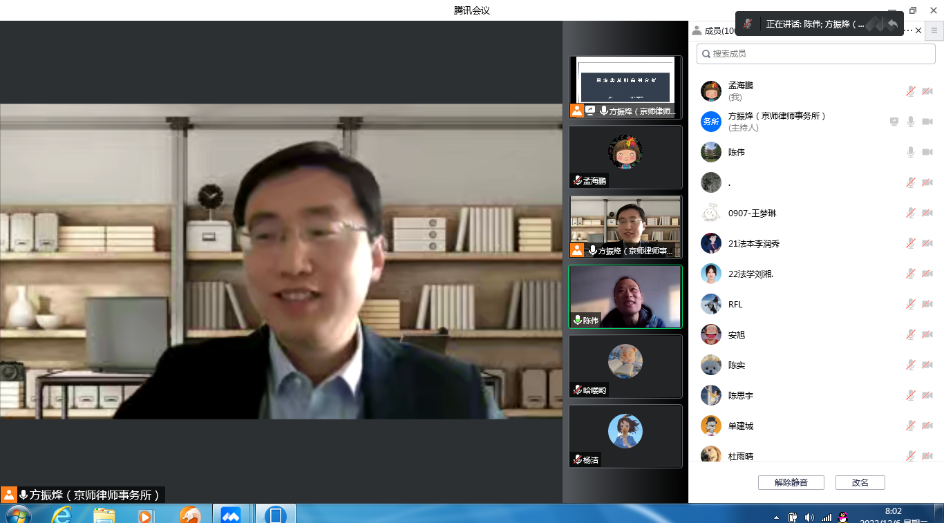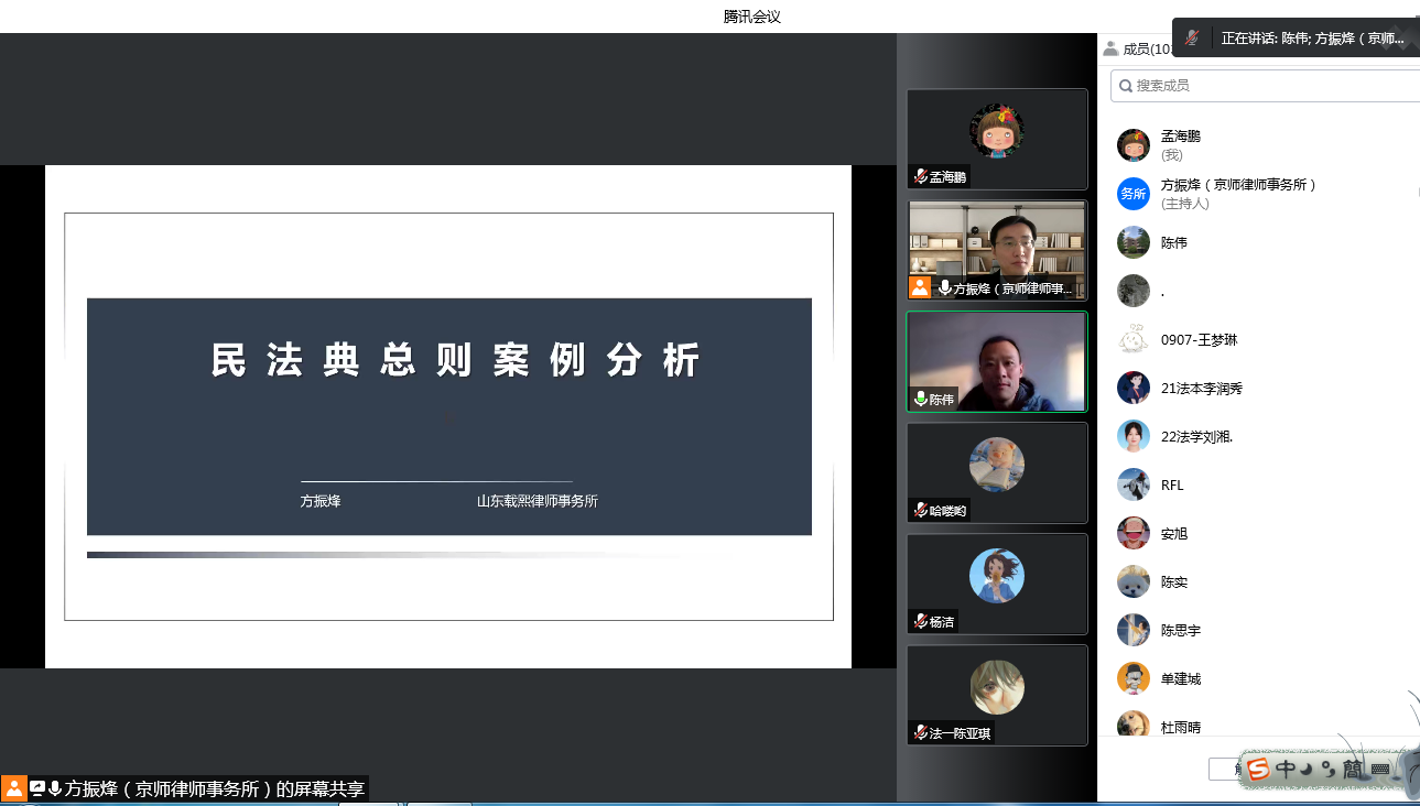 2022年12月6日,山东载熙律师事务所方振烽律师通过腾讯会议为德赢AC米兰中国官方网站2022级法学本科学生授课。方律师结合实务工作中所办理的案例,讲解了《民法典》总则部分的民事主体、民事法律行为、代理、诉讼时效、法律文书写作等内容。授课通过对具体案例的细节分析,贯穿涵盖了民法总论的多个重要知识点,内容生动丰富,受到同学们的好评。