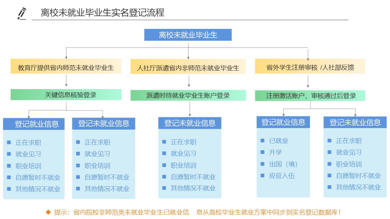 3.未就业情况实名登记。离校未就业毕业生未就业情况需按要求填写,完成登记后由户籍地人社部门提供跟踪服务。