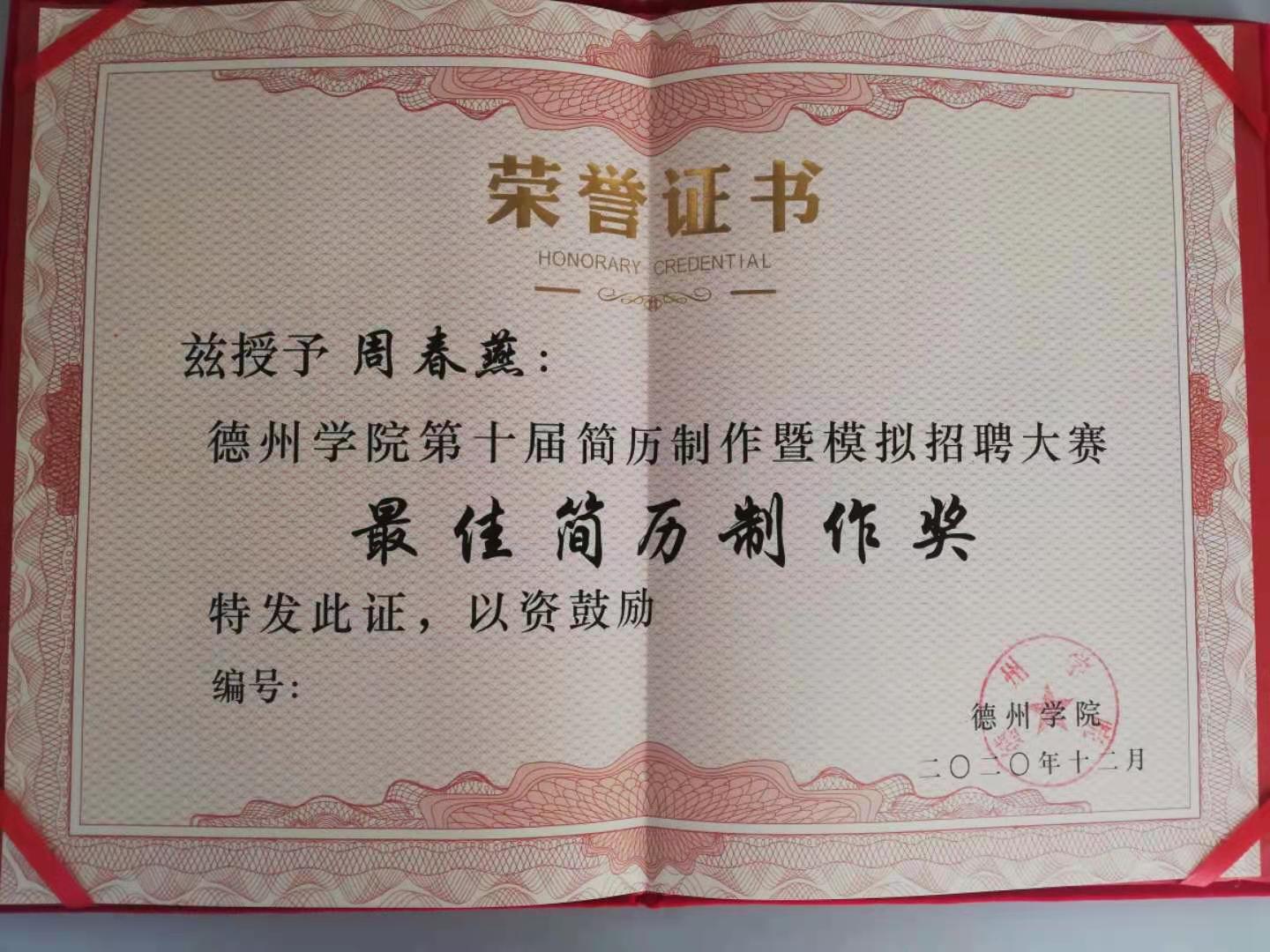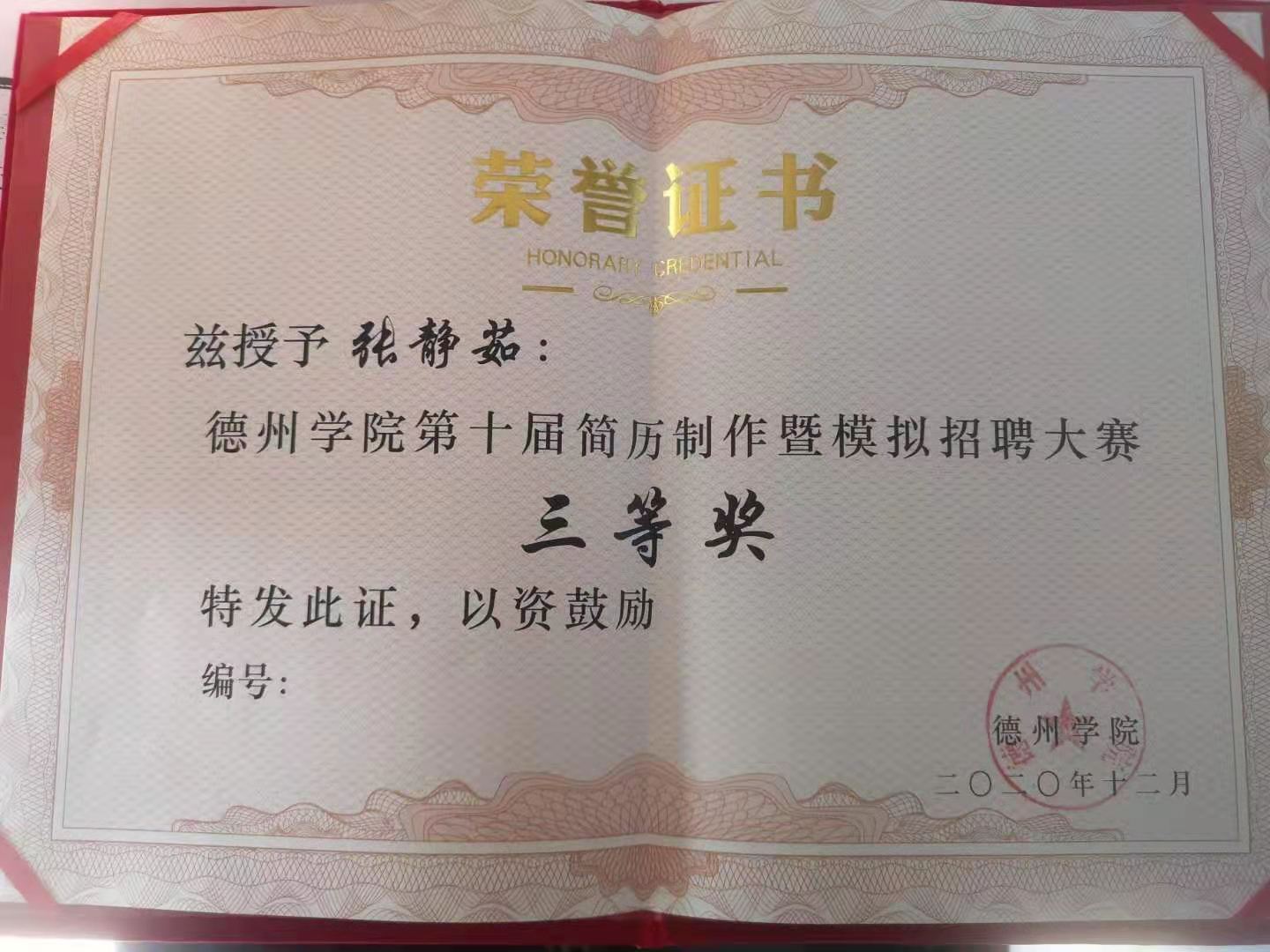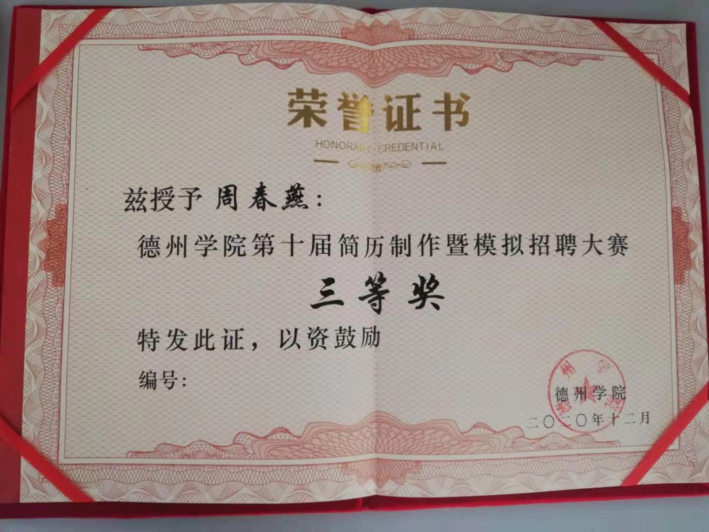 近日,德赢AC米兰中国官方网站2020年度大学生简历制作及模拟招聘大赛圆满结束,全校15名同学分获一、二、三等奖。德赢官网2018级行政管理专业本科班张静茹、周春燕同学获得大赛三等奖,其中周春燕同学还获得大赛最佳简历制作奖。德赢官网米彦老师荣获优秀指导教师奖。