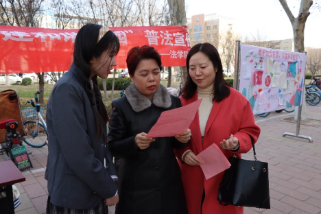 “《中华人民共和国妇女权益保障法》全文包括总则、政治权利、文化教育权益、劳动和社会保障权益、财产权益、人身权利、婚姻家庭权益、法律责任、附则共九章六十一条……”,在校园儒风广场,教工党支部与学生党支部开展“维护妇女权益 共建和谐校园”法律宣传。对校园女大学生、园林女工、餐厅阿姨等女性朋友逐条宣讲《中华人民共和国妇女权益保障法》法律法规,普及妇女权益受到侵害时寻求救助方法和途径等知识,活动发放宣传手册300余份,现场解答咨询问题30余条,帮助女性利用法律武器维护自身权益,提升全民妇女权益保障意识。