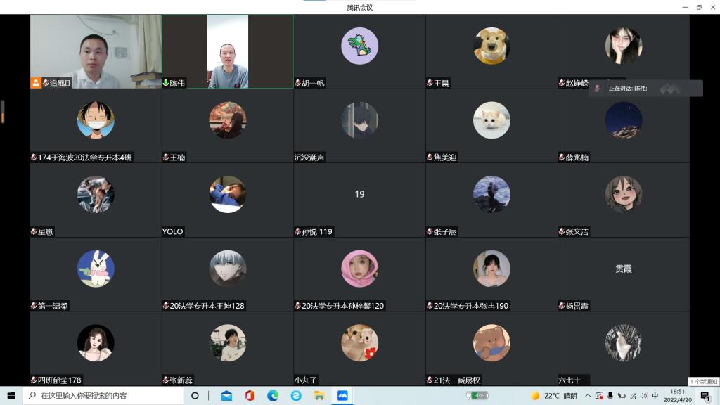 4月20日晚,德赢AC米兰中国官方网站举行了国家安全知识线上宣讲活动。邵玉东老师做了题为“规范网络行为 维护国家安全”的讲座,王梓钰同学做了题为“防范校园网络欺诈”的主题宣讲,2020级、2021级法学本科班全体同学参加了线上宣讲活动。