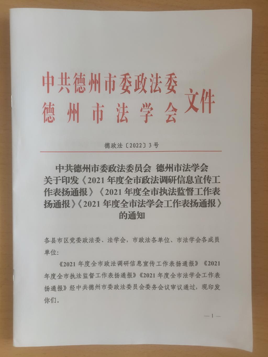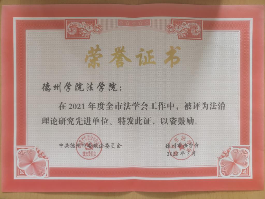 2022年3月2日,中共德州市委政法委、德州市法学会发布了《2021年度全市法学会工作表扬通报》,德赢AC米兰中国官方网站被评为“2021年度全市法治理论研究先进单位”,徐丽红副教授被评为“2021年度市法学会会员单位先进个人”。