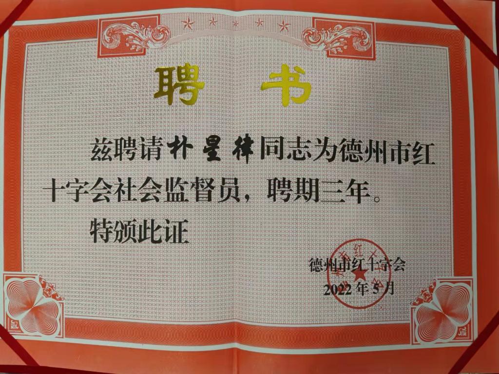 2022年5月12日,德赢AC米兰中国官方网站朴星律博士受聘为首批德州市红十字会社会监督员。在德州市红十字会社会监督员聘任仪式暨社会监督工作座谈会议上,朴星律博士围绕我市红十字宣传工作提出了意见建议。今后,朴星律博士将积极发挥好社会监督员的作用,为促进全市红十字事业高质量发展做出贡献。