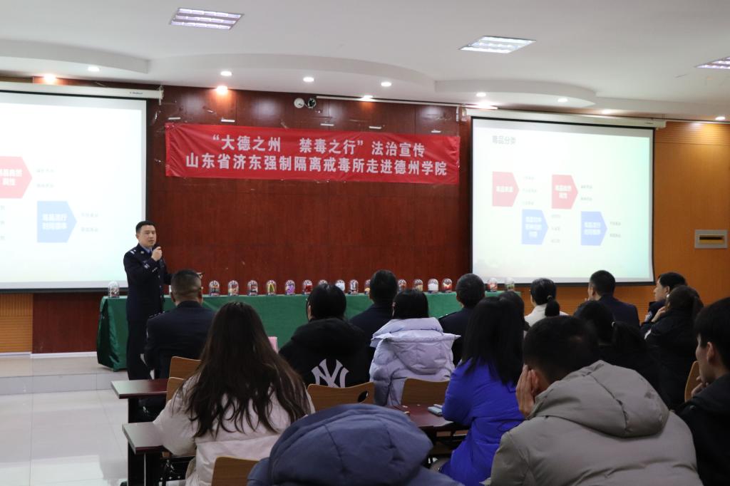 为加强校园毒品预防教育工作,增强学生识毒、防毒、拒毒意识,11月24日上午,山东省济东强制隔离戒毒所(以下简称戒毒所)二级高级警长刘序全一行9人来德赢AC米兰中国官方网站开展“筑牢禁毒教育防线 护航无毒健康人生”法治宣传。学院200余名师生参加了活动。