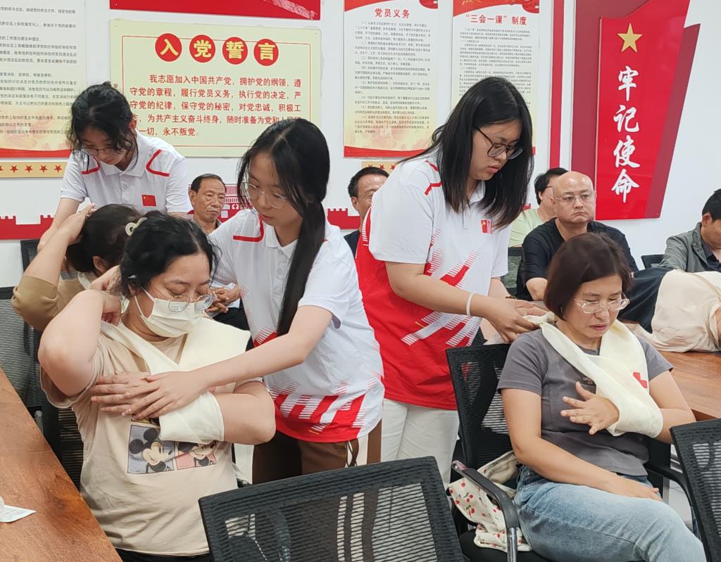 培训中,2022级行政管理专业张莹莹同学与其组员采用边讲解边演练的方式,向2024级同学讲解了心肺复苏的理论知识,演示了心肺复苏的过程;曾庆翰同学与其组员向同学们介绍了海姆立克急救法,展示了背部扣击法与胸部冲击法的具体应用。王欣怡同学与其组员为同学们讲解了外出血与严重出血情境下的高效止血技巧。在实操环节,培训团队成员亲自示范并引导2024级同学们学习三角巾包扎方法以及小悬臂带使用技巧。