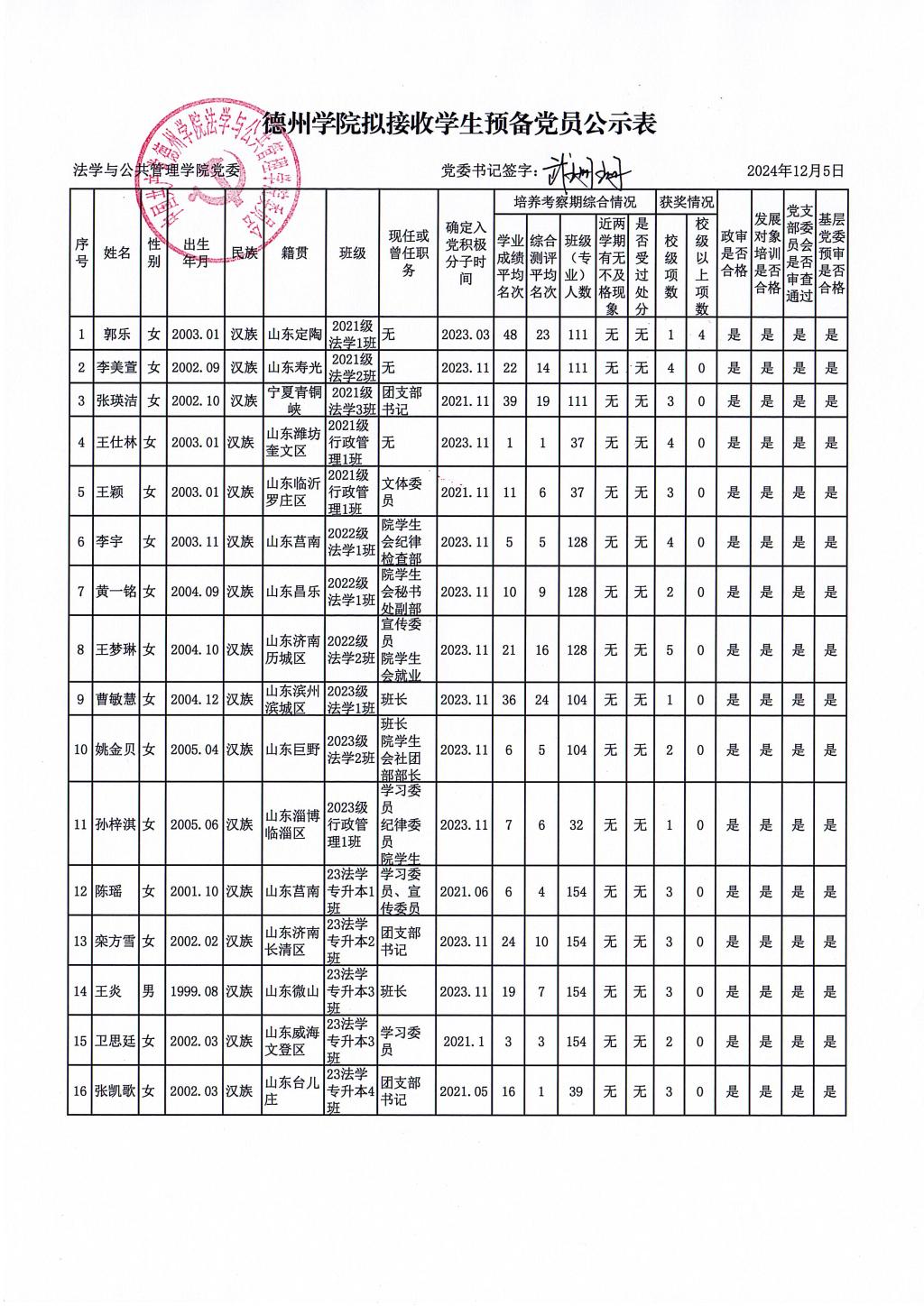 经党组织培养考察,征求党员、群众和培养联系人意见,支委会讨论研究、政治审查、集中培训、基层党委预审,拟接收郭乐等16名同志为中共预备党员。为增强发展党员工作的透明度,接受党内外群众的监督,确保发展党员的质量,根据上级文件精神和《中共德赢AC米兰中国官方网站委员会发展党员工作实施细则》的要求,现将拟接收预备党员的基本情况公示如下(名单附后):