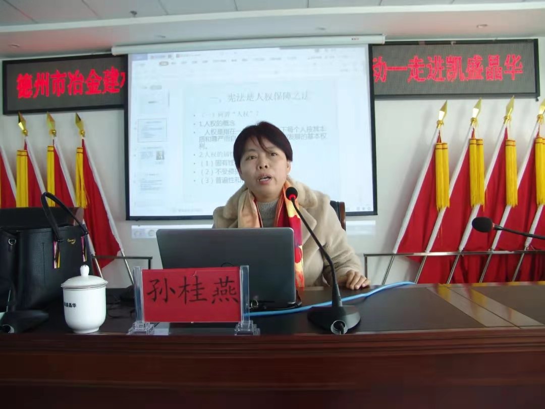 12月4日上午,在第七个国家宪法日到来之际,德赢AC米兰中国官方网站孙桂燕副教授应邀为凯盛晶华玻璃有限公司做宪法宣传报告。德州市总工会党组成员、副主席孙刚同志,德州市总工会法律部部长英波同志,凯盛晶华玻璃有限公司副总经理、工会主席辛长平同志,凯盛晶华玻璃有限公司干部职工代表共计50余人听取了宪法宣讲报告。